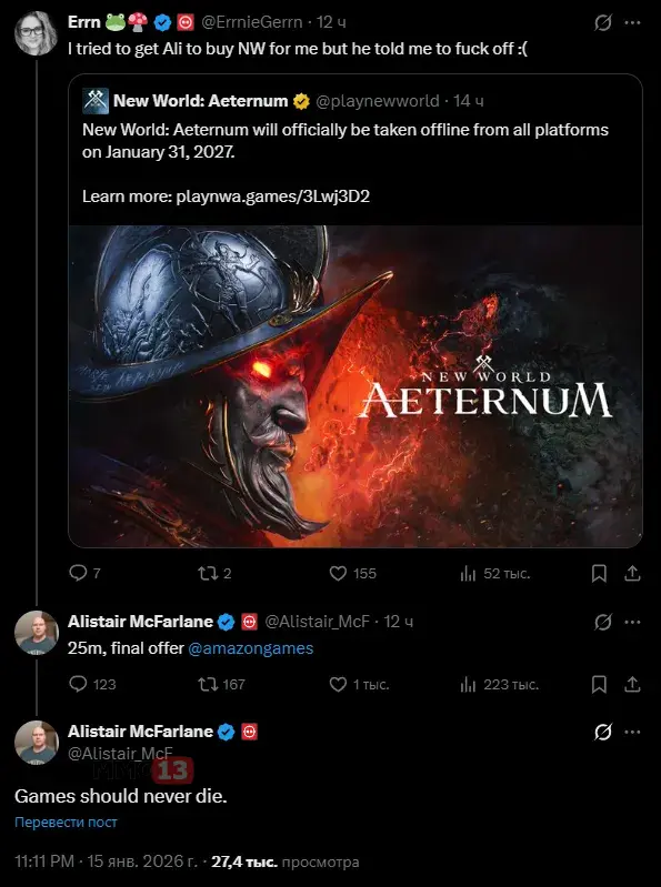 История с закрытием флагманской MMORPG New World: Aeternum от Amazon Games получила неожиданное продолжение. После того, как авторы подтвердили закрытие серверов в конце января 2027 года, в ситуацию вмешался Алистер Макфарлейн, операционный директор Facepunch Studios. Глава команды разработчиков симулятора выживания Rust публично предложил Amazon сделку на 25 миллионов долларов, чтобы выкупить проект и спасти его от неминуемой гибели.