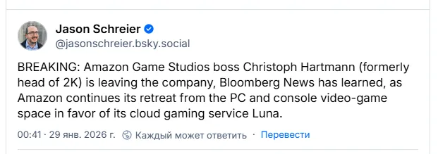 Кристоф Хартманн, возглавлявший Amazon Games, покидает компанию на фоне реструктуризации игрового бизнеса Amazon. Об этом сообщил журналист Джейсон Шрайер на своей странице в Bluesky.