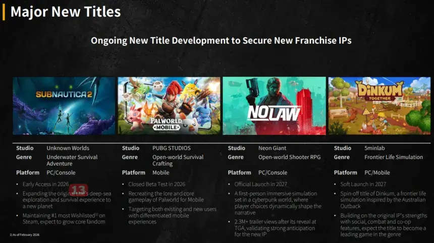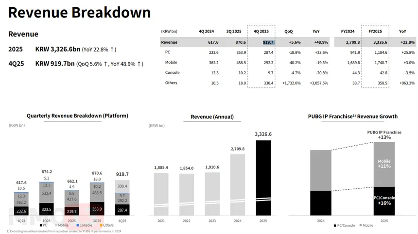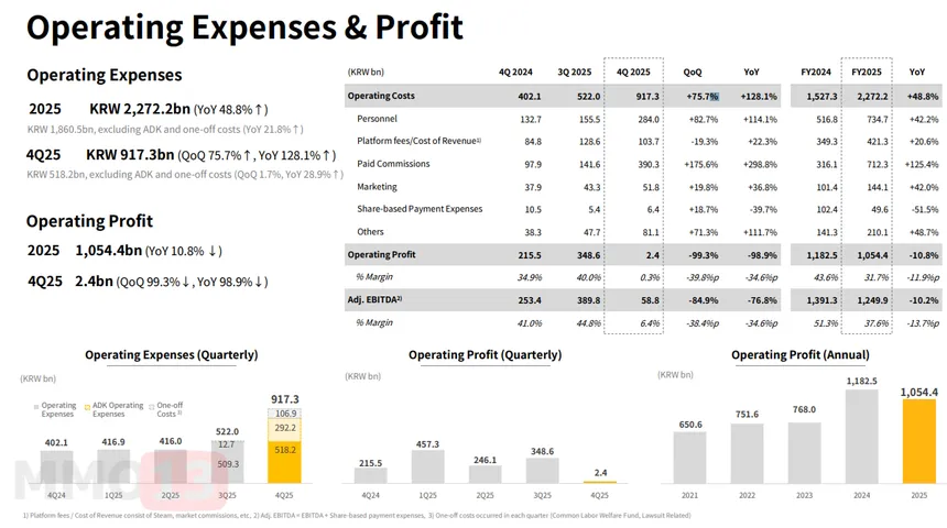 Компания Krafton отчиталась об убытках за четвёртый квартал 2025 года в размере 22,7 миллиарда вон (~15,504 миллиона долларов). Причиной убытков стали возросшие расходы в этот период, которые в итоге перекрыли выручку в размере 919,7 миллиарда вон (~628,167 миллиона долларов). Драйверами роста расходов стали комиссии (+175,6%), расходы на персонал (+82,7%) и маркетинг (+19,8%).