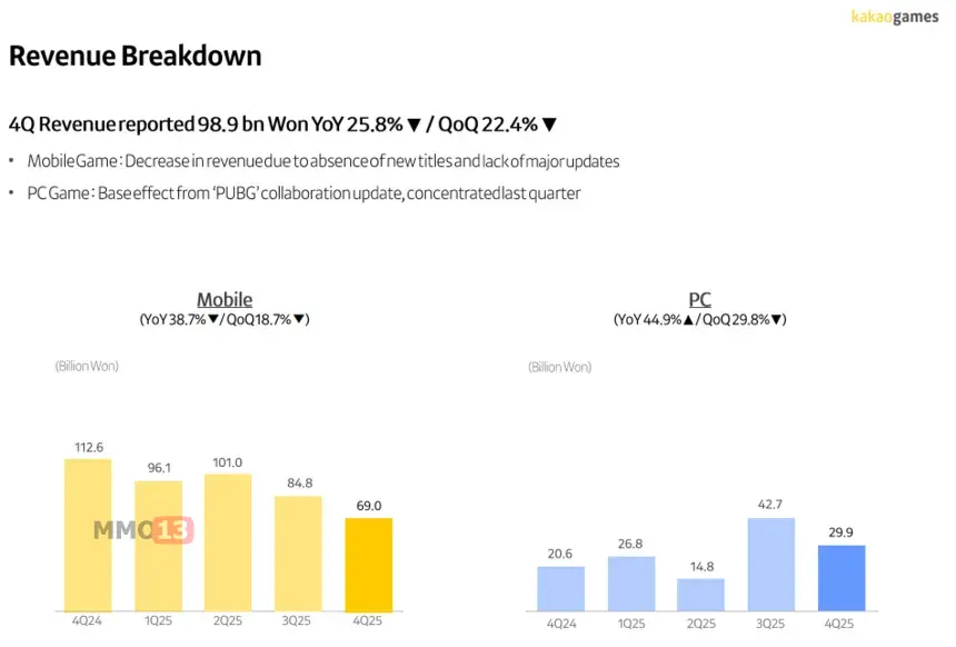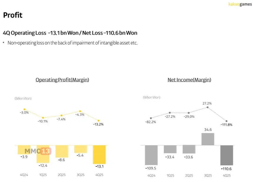 Что касается финансовых итогов, то в четвёртом квартале 2025 года Kakao Games получила выручку в размере 98,9 миллиарда вон (~ $67,5 миллиона долларов), а чистый убыток составил 110,6 миллиарда вон (~ $75,5 миллиона долларов).