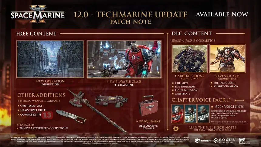 Saber Interactive выпустила масштабное обновление 12.0 для экшена от третьего лица Warhammer 40,000: Space Marine 2. Вместе с ним в игре появился новый класс Технодесантника, который является специалистом, ориентированным на контроль толпы и удержание позиций. Его уникальная способность Сервочереп-пушка автоматически ведет огонь по противникам в поле зрения, позволяя игроку одновременно сражаться в ближнем бою или проводить удары без прерывания текущих действий. Вместе с новым классом в арсенал добавили его каноничное оружие — топор Омниссии, способный наносить сокрушительный урон как одиночным целям, так и группам врагов при использовании заряженных атак.