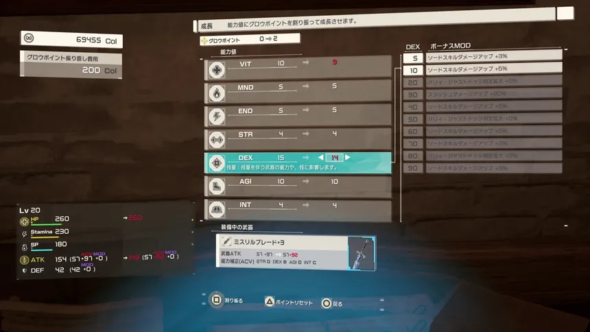 - Система характеристик напрямую связана с эффективностью конкретного оружия. Например, одноручные мечи получают бонусы от ловкости (DEX), а кинжалы — от проворства (AGI). Инвестирование очков в такие параметры, как живучесть (VIT) или выносливость (END), открывает дополнительные пассивные бонусы при достижении определенных порогов. При этом игра позволяет легко сбрасывать и перераспределять очки для смены стиля игры.