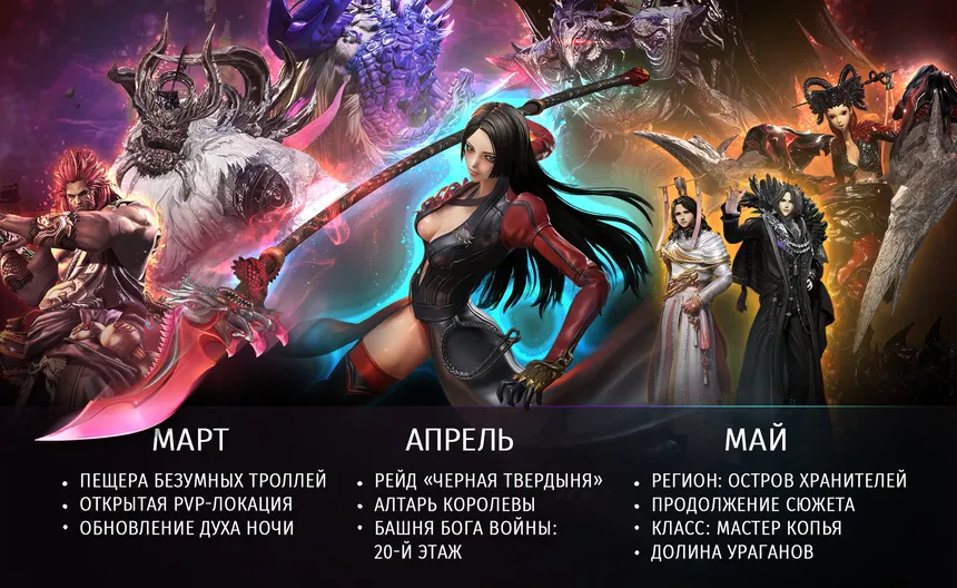 В марте 2026 года в игру добавят открытую PvP-локацию, в которой игроки смогут помериться друг с другом силами, а также подземелье «Пещера с безумными троллями» и новые вызовы для опытных Мастеров. В апреле добавят рейд «Черная твердыня» для 12 игроков, подземелье «Алтарь королевы» и 20-й этаж Башни Бога Войны. Наконец, майское обновление принесет с собой регион «Остров Хранителей», продолжит сюжет, откроет поле бое «Долина ураганов» для PvP и введет новый класс Мастер копья.