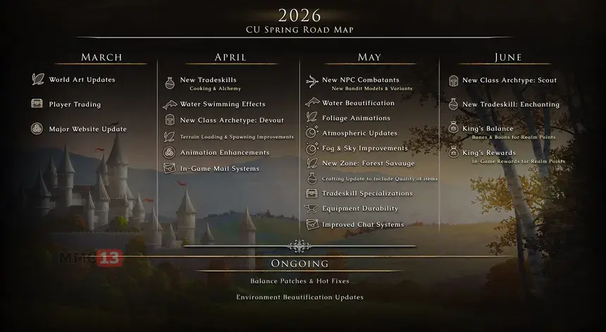 Вместе с запуском раннего доступа разработчики опубликовали дорожную карту с планами на второй квартал 2026 года. В апреле в игру добавят архетип Devout, систему почты, а также кулинарию и алхимию. Майское обновление принесет с собой лесную зону Forest Sauvage, новых NPC-врагов и специализации для ремесленных профессий. Июнь ознаменуется появлением класса Scout, системы зачарования предметов и введением механизмов King's Balance и King's Rewards, направленных на поощрение активных участников RvR-сражений.