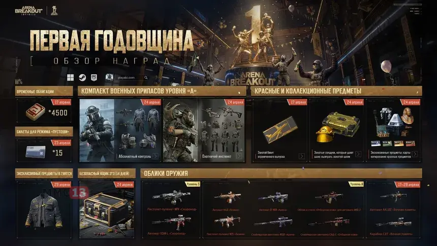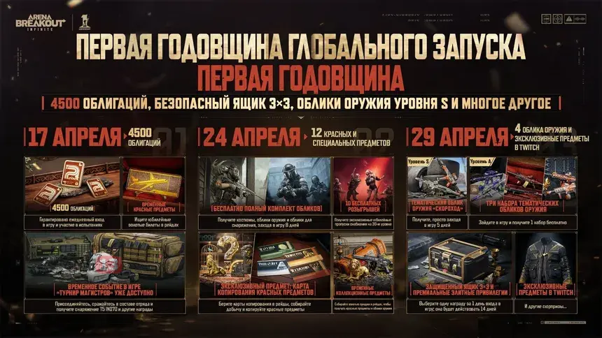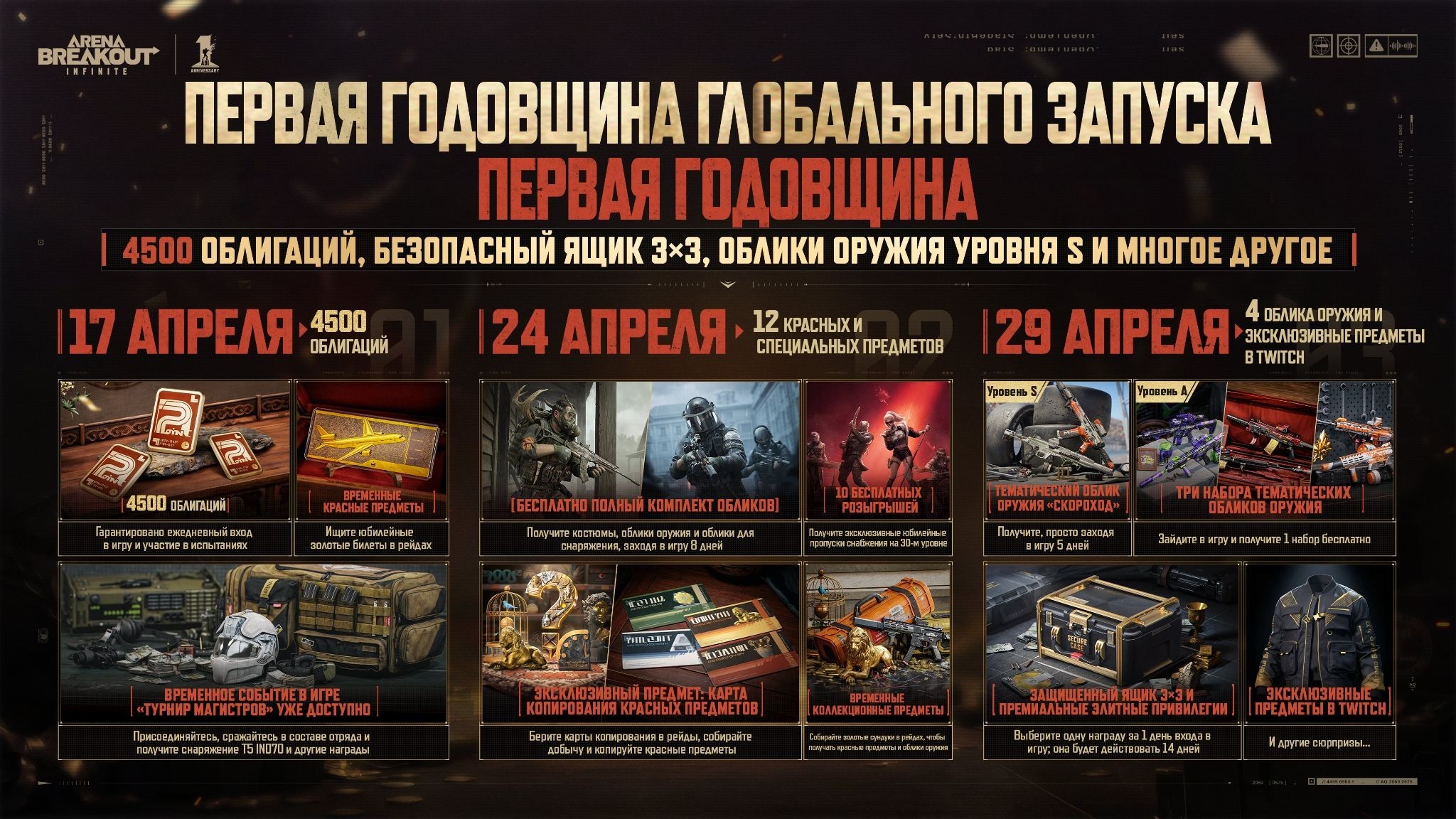 Разработчики экстракшен-шутера от первого лица Arena Breakout: Infinite запустили серию праздничных мероприятий, приуроченных к первой годовщине проекта. Начиная с 17 апреля, игроки могут принять участие в многоэтапном событии, которое продлится до конца месяца. Главным пунктом программы стала возможность получить рекордное количество премиальной валюты — 4500 облигаций, которые гарантированы всем пользователям за ежедневный вход в игру и выполнение специальных поручений.