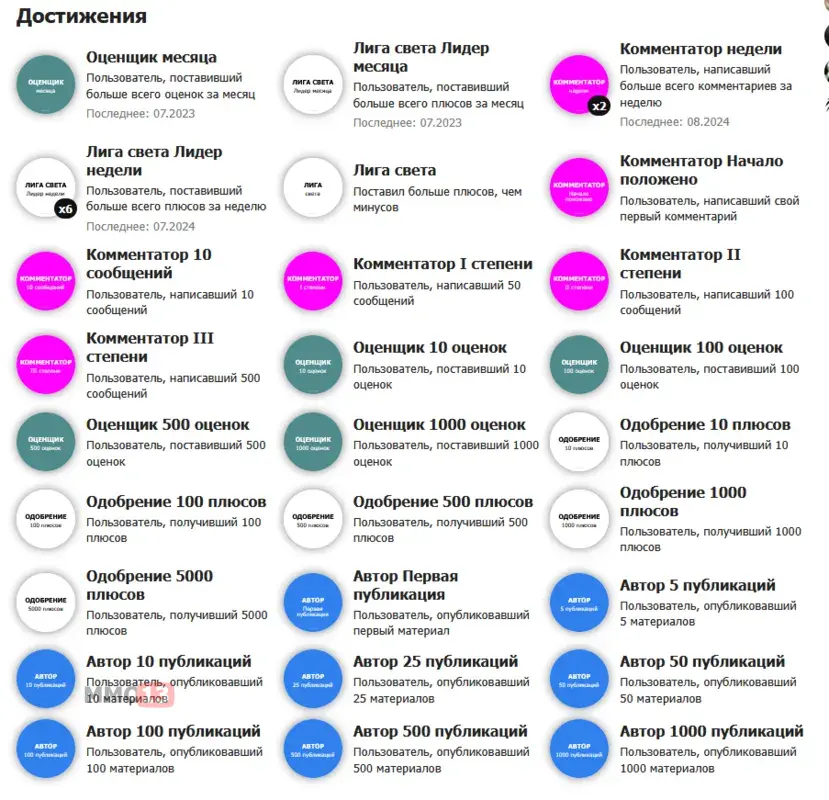 Однако 27 апреля 2026 года портал получил обновление, предназначенное именно для пользователей — систему достижений. В данный момент список включает около 30 ачивок и оценивает активность по нескольким параметрам: количество положительных и отрицательных оценок, комментариев и опубликованных постов.